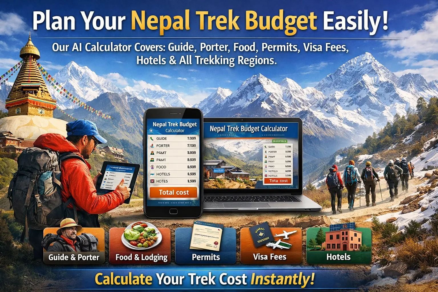Esta calculadora cubre los costos de trekking solo dentro de Nepal. No se incluyen vuelos internacionales. (Para una mejor información precisa, póngase en contacto con TrekPathways)